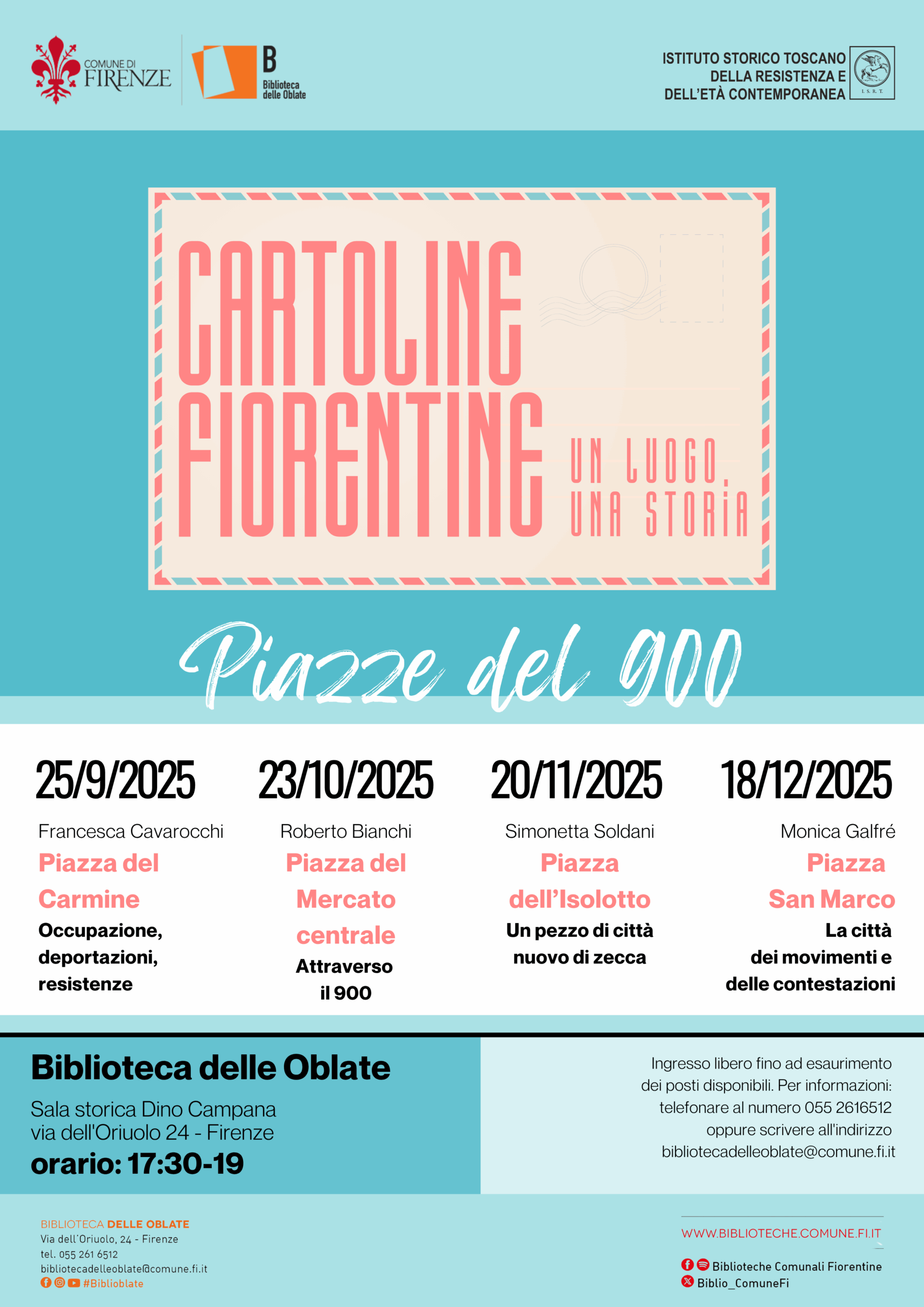Il ciclo di incontri «Cartoline Fiorentine – Un luogo una storia. Piazze del Novecento» è realizzato dall’ISRT in collaborazione con la Biblioteca delle Oblate e il sostegno dell’Assessorato alla Cultura del Comune di Firenze.