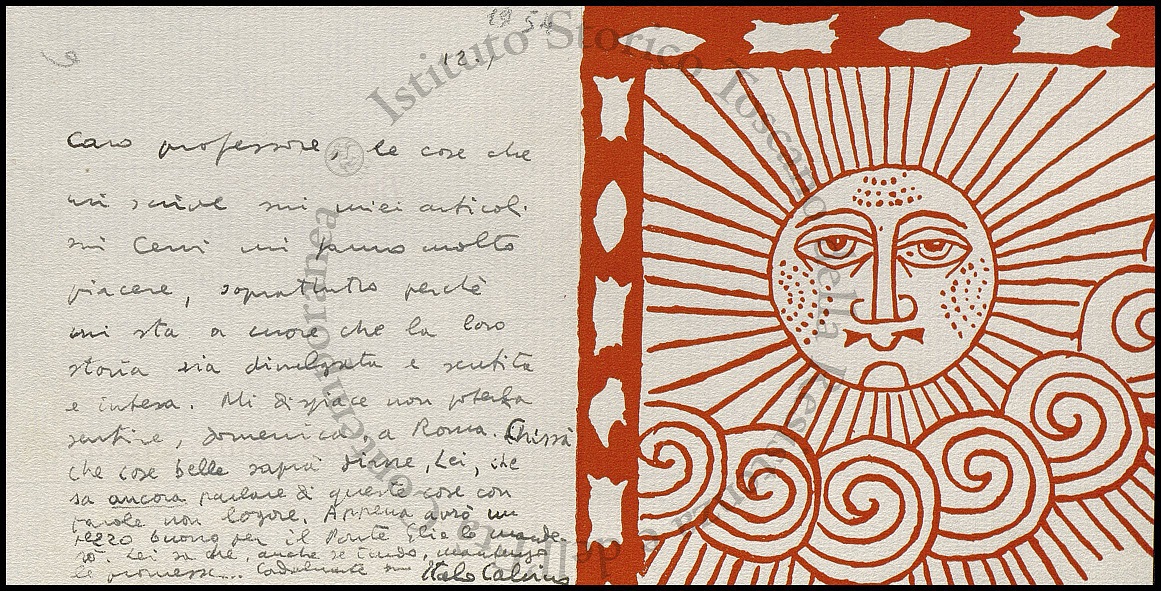 I messaggi, dal tono essenziale ma cordialissimo, indirizzati da Calvino a Calamandrei, due personalità tanto eccezionali quanto diverse e comunque unite da una profonda adesione alla vita civile, costituiscono la testimonianza di un rapporto di profonda stima reciproca e dell’impegno comune per una riflessione che – guardando all’esperienza drammatica della dittatura nazifascista, all’orrore della guerra e ai valori della Resistenza – è il fondamento per la costruzione della nuova democrazia. L’ultimo messaggio che troviamo in archivio porta la data del 12 gennaio 1954, è scritto a mano sul biglietto di auguri per il nuovo anno stampato dall’Einaudi con l’immagine di un bel sole. “Caro professore le cose che mi scrive sui miei articoli sui Cervi mi fanno molto piacere – afferma Calvino che in quel periodo ha una intensa collaborazione con L’Unità – soprattutto perché mi sta a cuore che la loro storia sia divulgata e sentita e intesa. Mi dispiace non poterla sentire, domenica, a Roma. Chissà che cose belle saprà dirne lei che sa parlare ancora di queste cose con parole non logore”.