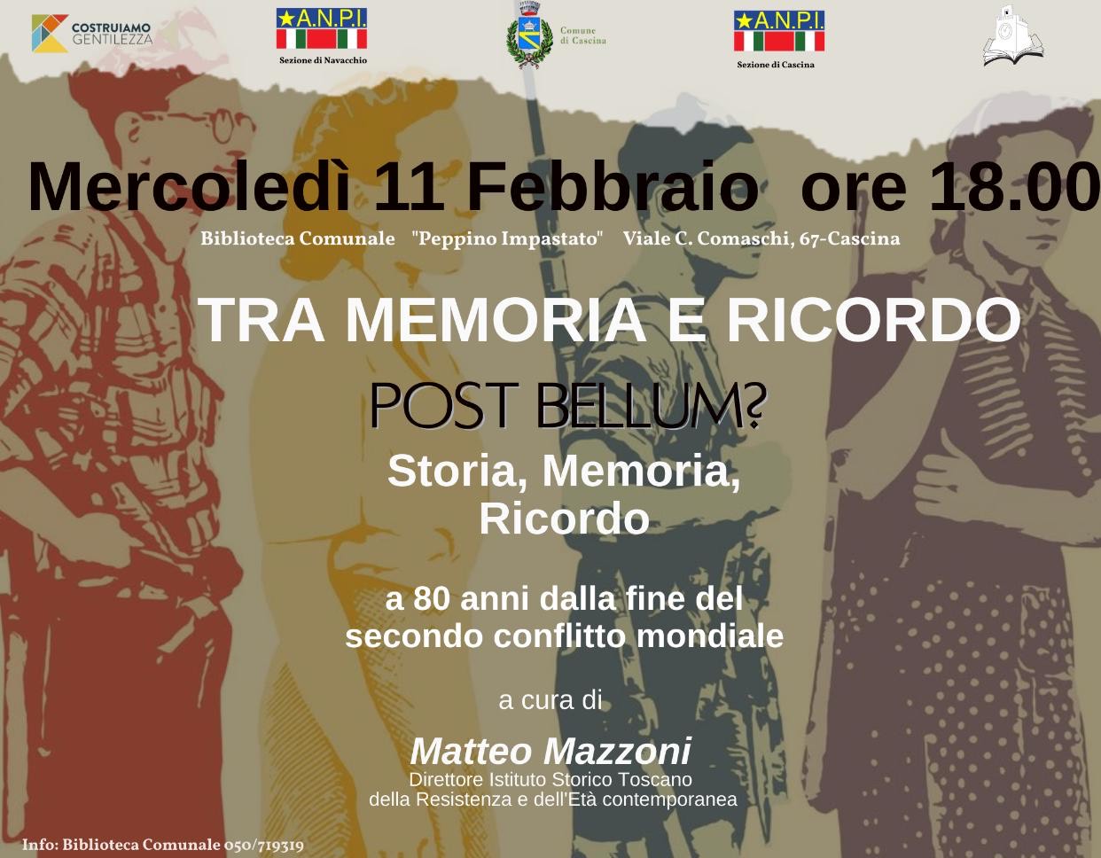 Mercoledì 11 febbraio a Cascina, l’Amministrazione comunale vi invita alla conferenza del nostro direttore, Matteo Mazzoni, POST BELLUM? Storia, Memoria, Ricordo a 80 anni dalla fine del secondo conflitto mondiale che si terrà alle ore 18.00 alla Biblioteca Comunale “Peppino Impastato” Viale C. Comaschi 67, Cascina.