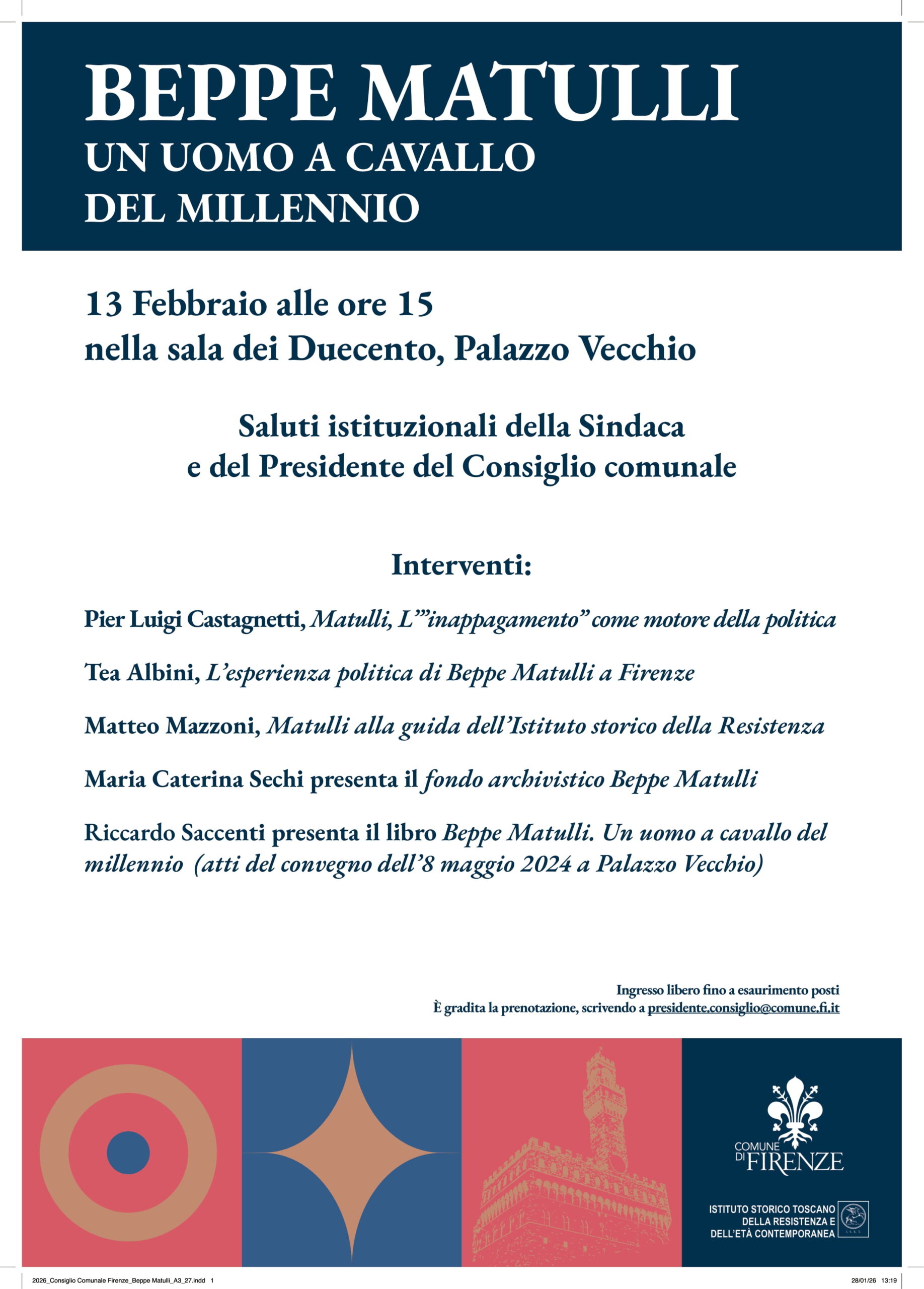 Il 13 febbraio, alle ore 15.00, nel Salone dei Duecento in Palazzo Vecchio, il Comune di Firenze e il nostro Istituto vi invitano al seminario in ricordo di Beppe Matulli a due anni dalla scomparsa.