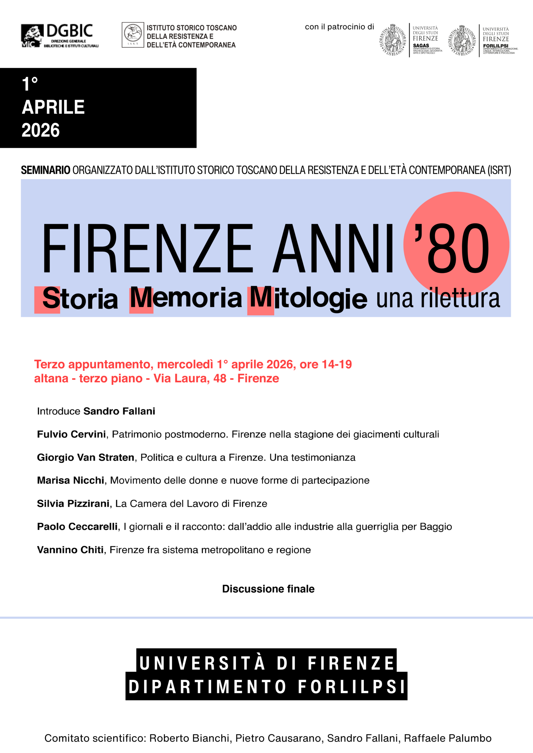 Il nostro Istituto vi invita a partecipare al terzo appuntamento del ciclo di seminari sulla Firenze degli anni Ottanta del Novecento: Firenze anni ’80. Storia, memoria, mitologie: Una rilettura