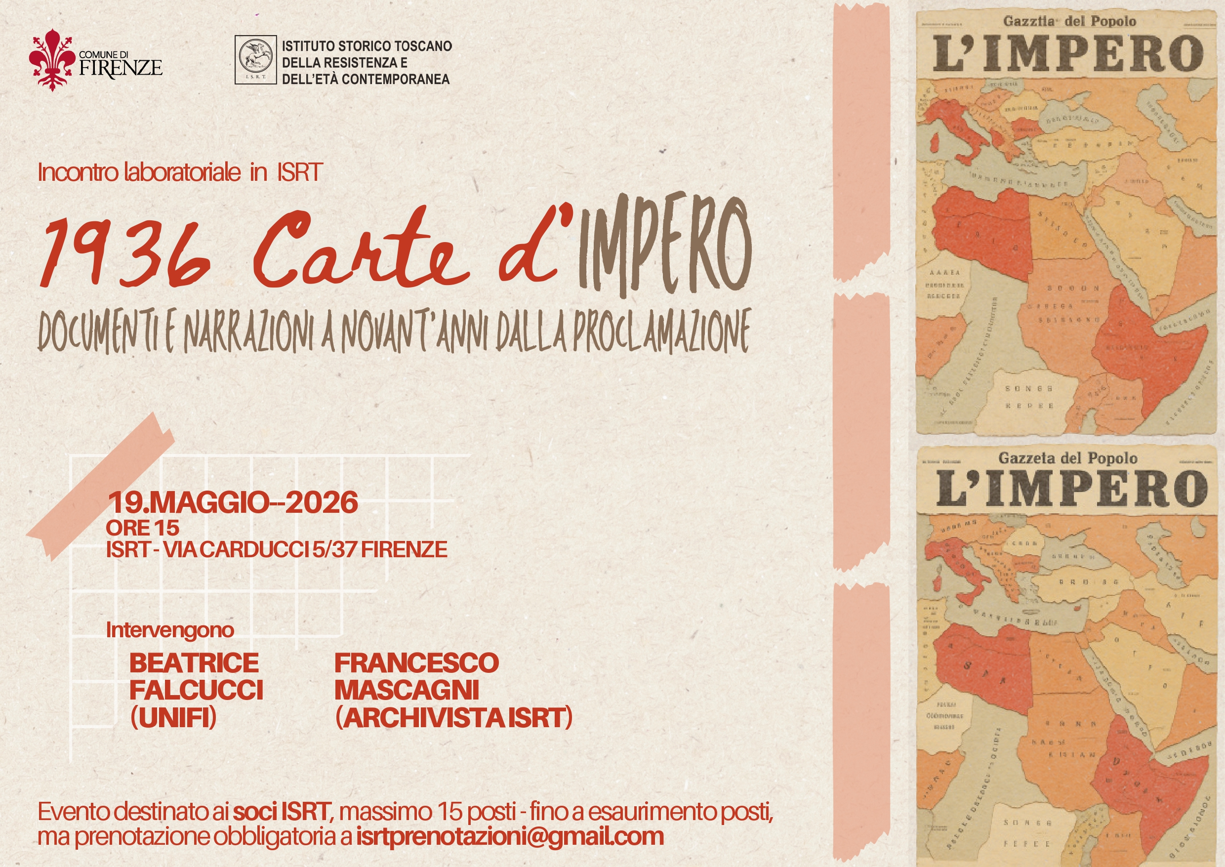 Martedì 19 maggio presso la nostra sede si terrà un incontro laboratoriale riservato ai nostri Soci in occasione del novantesimo anniversario della proclamazione dell’impero. Interverranno Beatrice Falcucci (Ricercatrice UniFi) e Francesco Mascagni (Responsabile Archivio ISRT). Trovate tutte le informazioni per partecipare nella locandina